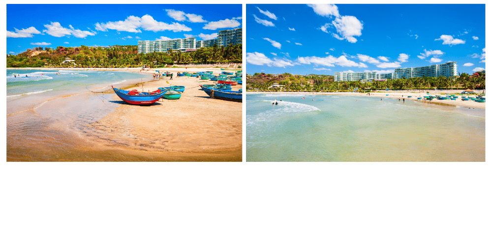 Dans la province de Bình Thuận, la plage de Mũi Né est un lieu unique où se mêlent plages de sable fin et vastes dunes rougeâtres, façonnées par les vents marins. Cet endroit offre un spectacle visuel impressionnant, où l’on peut passer de l’effervescence des activités nautiques à la sérénité des dunes, idéales pour les balades et les séances photo.