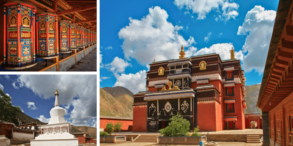 Le complexe de Labrang s’étend sur plus de 80 hectares et comprend de nombreux halls, pavillons et stupas. Le Hall de l’Assemblée (Dukhang) est particulièrement remarquable avec ses fresques colorées et ses statues dorées de Bouddha. L’architecture du temple combine des éléments tibétains et chinois, créant une harmonie unique.