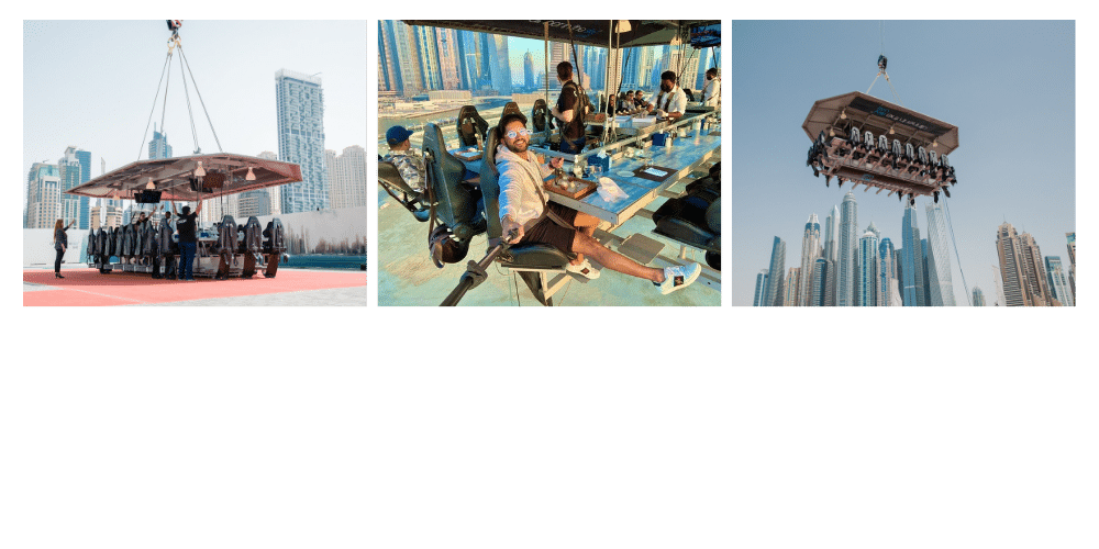 Suspendu à 50 mètres au-dessus de la ville, ce restaurant-grue propose une expérience littéralement vertigineuse. Installés autour d’une table arrimée à une plateforme suspendue, les convives profitent d’un repas gastronomique tout en admirant une vue panoramique sur les gratte-ciels de Downtown Dubaï, la palmeraie de Jumeirah, et même le désert à l’horizon. L’expérience est orchestrée avec rigueur : harnais de sécurité, service millimétré, plats soignés malgré les conditions en hauteur.
