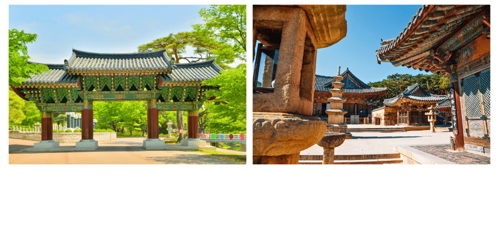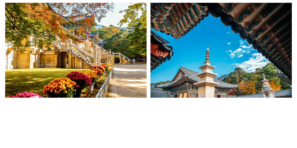 Le complexe se distingue par ses pagodes Dabotap et Seokgatap, des structures en pierre finement sculptées qui représentent la quête de l’illumination. Le temple est également traversé par des ponts en pierre symbolisant le passage vers le royaume spirituel, notamment le Chilbogyo et le Baegungyo.Bulguksa abrite des trésors nationaux, notamment des statues du Bouddha Sakyamuni et de Gwaneum (Avalokiteshvara), la déesse de la compassion. Ces sculptures en bronze sont des exemples impressionnants de l’art sacré coréen. Le temple, avec ses pavillons et ses jardins harmonieux, est un lieu à visiter pour ceux qui veulent découvrir la splendeur de l’architecture bouddhiste et la sérénité de ce sanctuaire.