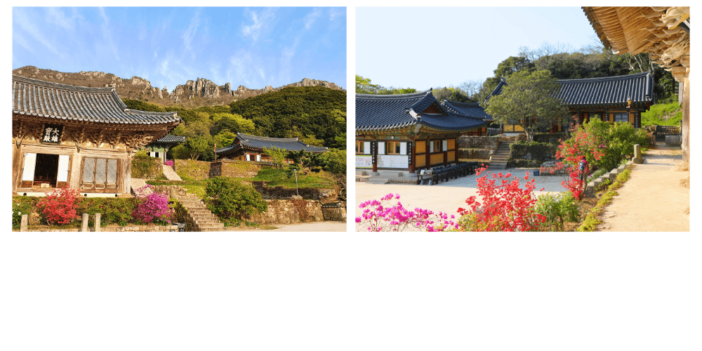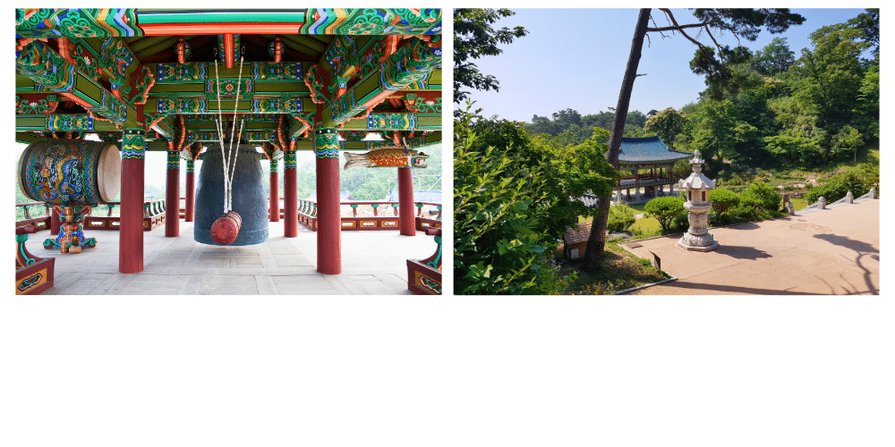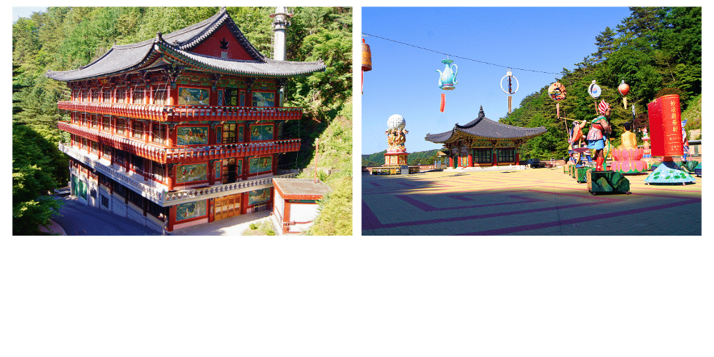 Le temple est entouré de nature, avec la cascade Guseong à proximité, où une légende raconte que la fille d’un roi a été transformée en dragon par un esprit malveillant avant d’être délivrée par un moine bouddhiste. Le Pavillon Daeungjeon, le cœur du temple, abrite une statue du Bouddha Sakyamuni et sert de lieu de méditation et de prière.