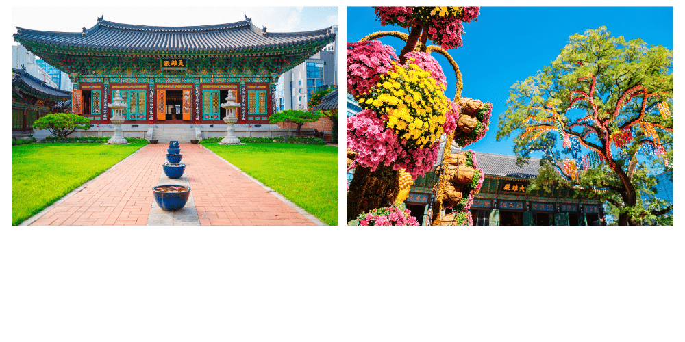 Le Daeungjeon, le pavillon principal, abrite une statue de Bouddha Sakyamuni, et est le centre des cérémonies bouddhistes, notamment lors du festival des lanternes de lotus qui marque l’anniversaire du Bouddha. Ce festival transforme le temple et ses alentours en un spectacle de lumière féerique, avec des milliers de lanternes illuminant le ciel.