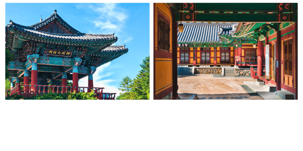 L’architecture des temples en Corée du Sud, influencée par le bouddhisme, se distingue par sa simplicité élégante, utilisant le bois, la pierre et des techniques de construction séculaire qui se fondent harmonieusement dans la nature environnante. Chaque temple raconte une histoire unique, qu’il s’agisse de la préservation de textes anciens comme au Temple Haeinsa, ou de la méditation solitaire sur les rives de la mer comme au Temple Naksansa. Nombre de ces temples sont aussi des symboles de résilience, ayant survécu aux guerres, aux invasions et aux ravages du temps, tout en continuant à être des centres de culte actifs.
