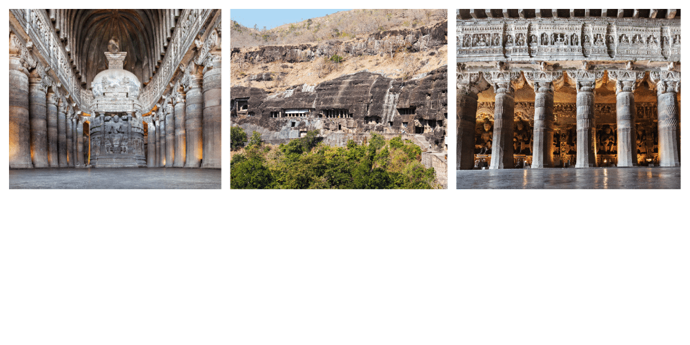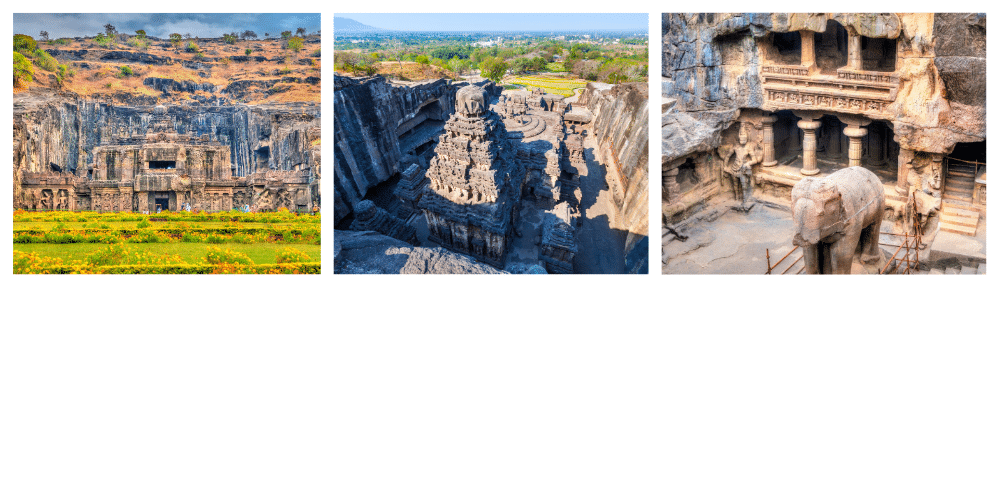 - Le site d’Ellora regroupe 34 grottes bouddhistes, hindoues et jaïnes — Kailasa est la plus spectaculaire.