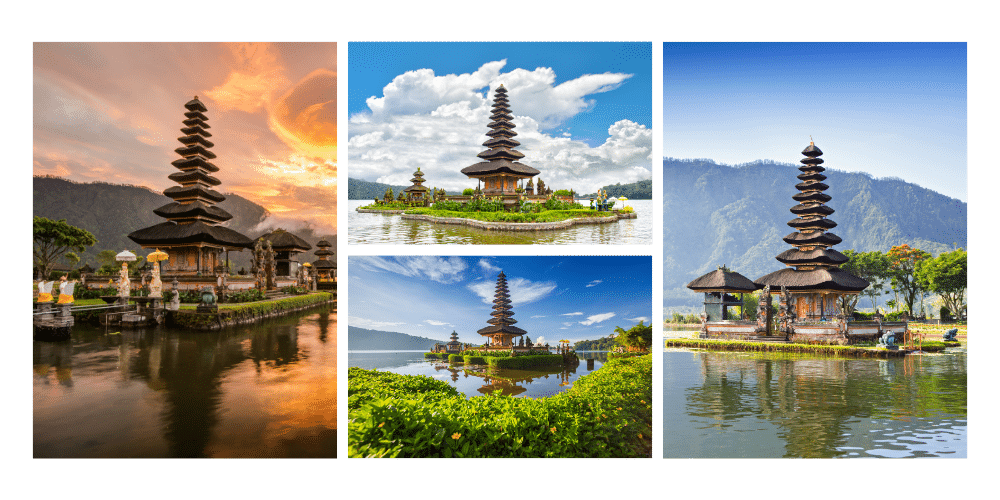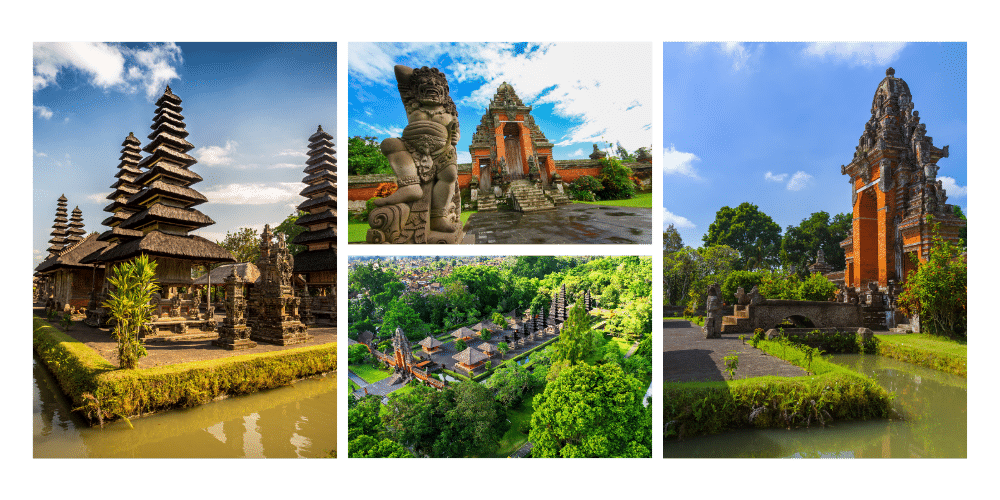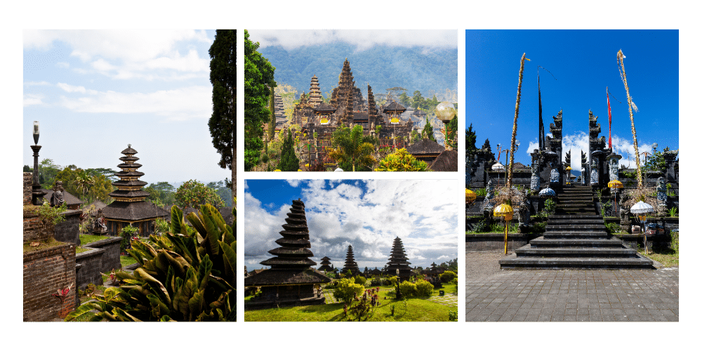 - À Bali, les temples de montagne comme le Pura Besakih ou le temple de Lempuyang côtoient des sanctuaires au bord de l’océan Indien comme Pura Tanah Lot.
