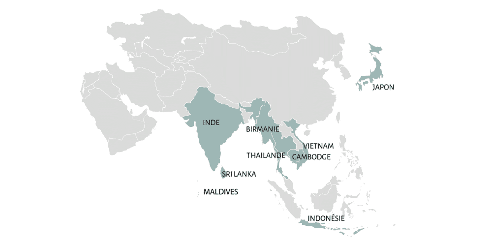Pour une destination authentique et qui ne ressemble à aucune autre : rendez-vous en Birmanie où la spiritualité et la douceur vous berceront durant votre voyage. Survoler le site de Bagan en montgolfière au petit matin et admirer les pagodes et stupas ; s’offrir une croisière romantique sur le lac Inle et partager des moments avec les habitants des villages flottants ou bien se détendre sur une plage à Ngapa ou Ngapali… La Birmanie vous offrira de magnifiques expériences dont vous vous souviendrez pour toujours !