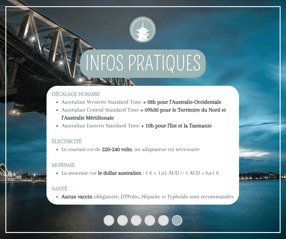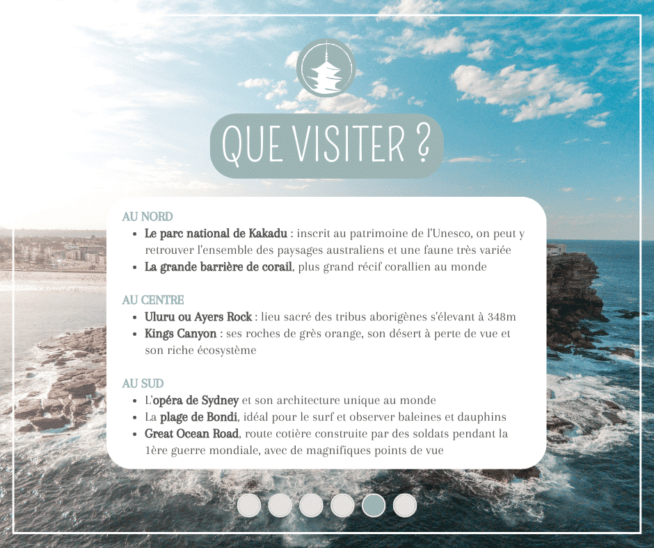 G’Day ! Bienvenue en Australie ! A l’autre bout du monde, isolée pendant des millénaires du reste de la planète, entre l’Asie et l’Océanie, l’Australie a évolué à son propre rythme. Le continent reste une terre mystérieuse : celle des routes infinies, de la savane, des fermes gigantesques, des déserts rouges, des cités décontractées, des surfeurs et des forêts impénétrables. Une immensité habitée par à peine 18 millions d’humains et… 40 millions de kangourous ! Ici, de bush en désert infini, de canyons en forêts tropicales, les grands espaces n’ont pas trouvé meilleure dimension… Panoramas insolites, culture bouillonnante et art aborigène unique, venez découvrir après plus de 20h de vol, les grandes villes Sydney et Melbourne, le célèbre centre rouge, le parc de Kakadu, Kangaroo Island ou encore de la grande barrière de corail… et bien d’autres encore : le pays, il est vrai, a de quoi séduire !