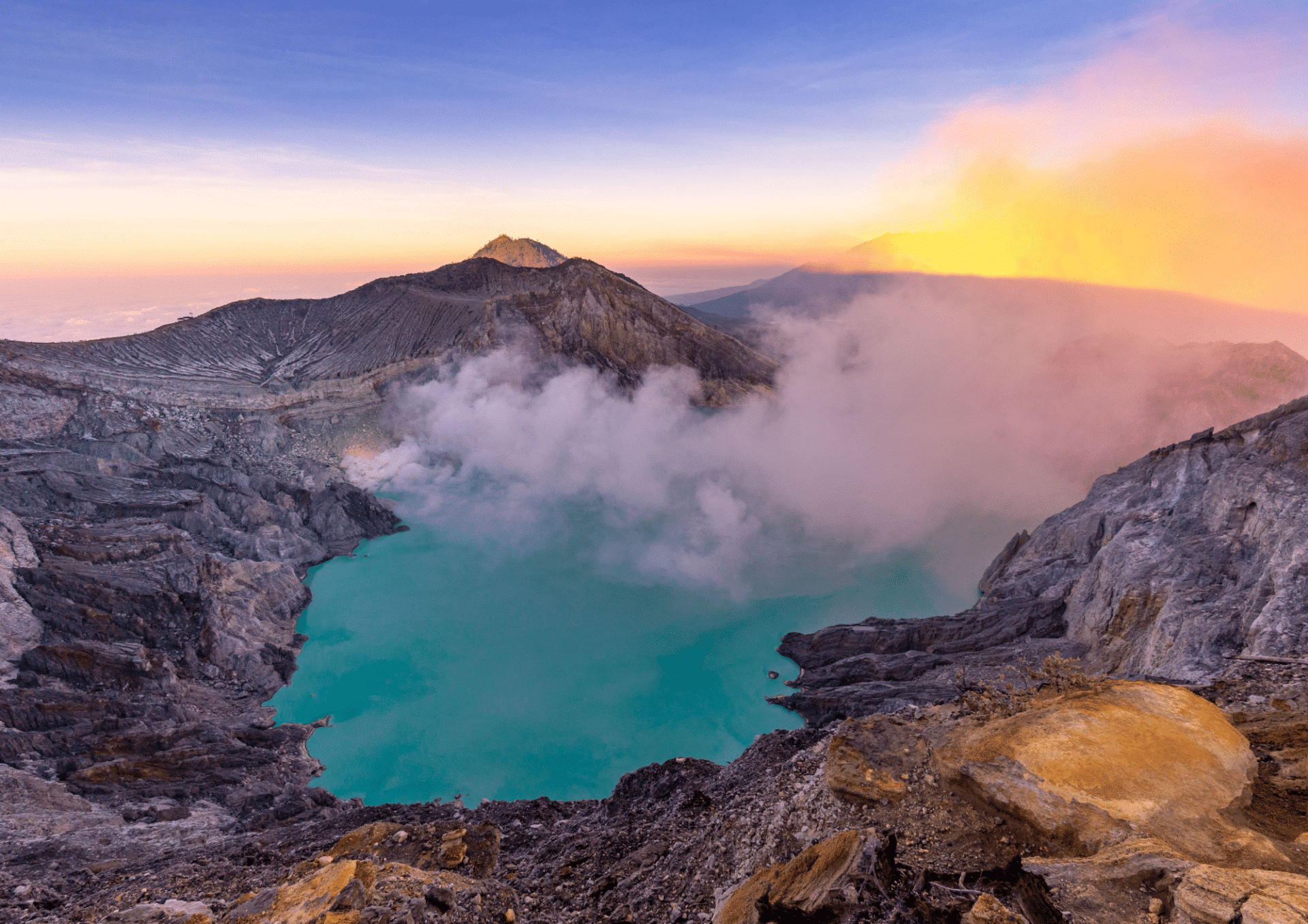 A votre arrivée au bord du cratère de l’Ijen, vous découvrirez un panorama époustouflant sur le lac turquoise et ses fumerolles de soufre.