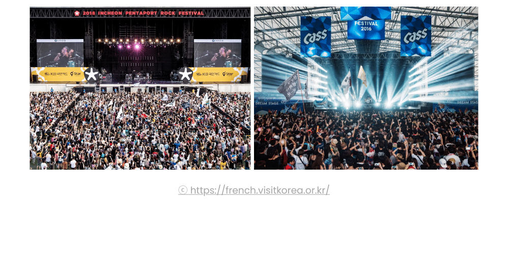 Les amateurs de rock ne voudront pas manquer cet évènement : le festival Pentaport Rock, qui se déroule en août à Incheon. Une ambiance très festive dans laquelle les visiteurs viennent écouter des groupes coréens et internationaux, au cœur du parc de Pentaport.