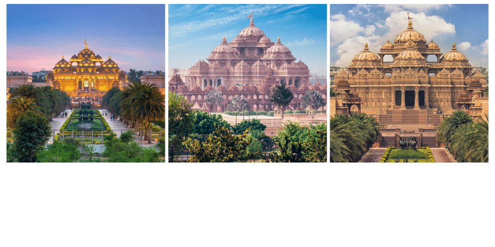 Akshardham est entièrement construit en grès rose et marbre blanc, sans utiliser une seule barre d’acier. Cela reflète l’ancienne tradition indienne de la construction de temples qui se veut spirituellement « pure ». Ce temple est aussi remarquable pour son architecture symétrique et ses sculptures représentant des scènes de la mythologie hindoue. À l’intérieur, on trouve une statue dorée de Swaminarayan, mesurant 3,4 mètres de haut, entourée de sculptures de saints et d’avatars hindous.Akshardham se distingue également par ses expositions culturelles, telles que le spectacle de lumière sur l’eau, le Yagnapurush Kund (la plus grande fontaine à gradins du monde) et une exposition interactive sur l’histoire spirituelle de l’Inde. Ce temple est un lieu à visiter non seulement pour sa beauté architecturale, mais aussi pour son aspect éducatif et spirituel, un lieu où l’ancien et le moderne coexistent harmonieusement.