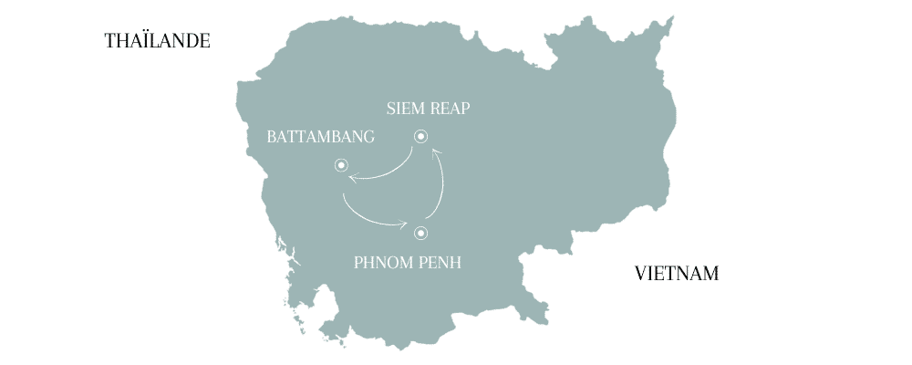 Asie Online vous propose un voyage de 10 jours en petit groupe pour découvrir les fabuleux temples d’Angkor, s’imprégner de la vie locale dans la campagne de Battambang mais aussi s’émerveiller devant un magnifique coucher du soleil sur les temples d’Angkor, accompagné d’un apéritif. Vous aurez aussi l’occasion de profiter d’un dîner croisière sur le Mékong.