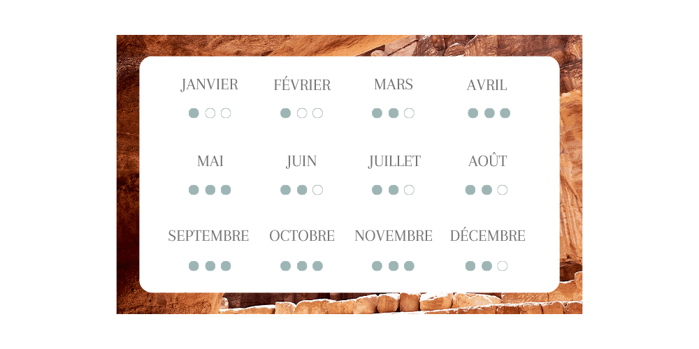 La Jordanie possède un climat similaire au nôtre, tempéré avec la présence de la mer et du désert. La haute saison s’étend de fin mars à fin mai et de septembre à novembre.
