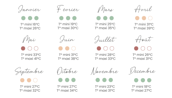 Udaipur bénéficie d’un climat semi-aride et plutôt sec avec des températures moyennes de 33°. La meilleure période pour partir en voyage est de janvier à avril, en juin et de septembre à décembre. La météo est vraiment idéale de janvier à mars et d’octobre à décembre.