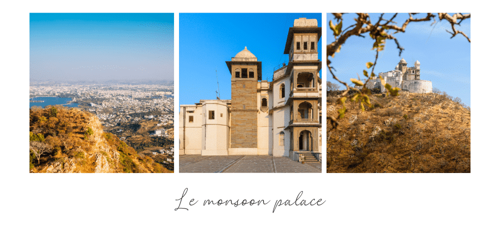 Sur une colline au-dessus de la ville, le Monsoon palace (palais de la mousson) était un lieu privilégié pour la famille royale durant la période de la mousson. Après avoir appartenu à la royauté, il a été redonné au gouvernement puis a été restauré durant quelques mois. Ce n’est pas le plus beau palais ni le plus impressionnant d’Udaipur mais sa position géographique est un vrai atout, surtout au coucher du soleil avec une vue imprenable sur toute la ville et ses lacs.