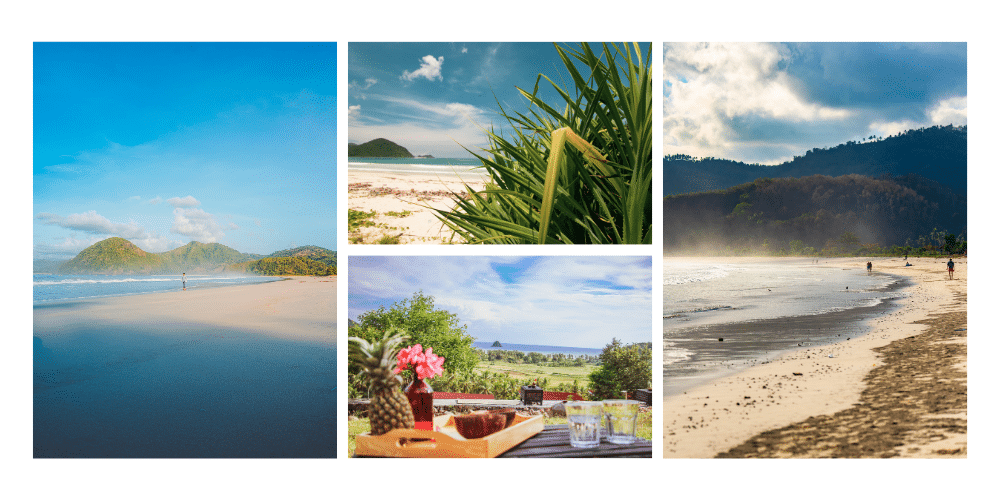 Le sable y est étonnamment doux, presque farineux, et l’eau turquoise contraste avec le vert des collines environnantes. À l’écart des grands resorts, on y croise encore des pêcheurs réparant leurs filets sous des huttes de bambou, des vendeuses de sarongs qui discutent en sasak, et parfois des enfants jouant au foot sur le sable en fin de journée.