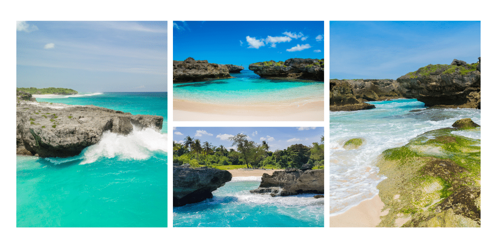- L’eau est d’un turquoise limpide, avec des nuances qui vont du bleu clair près du rivage au bleu profond au large. La clarté est assez bonne, et on perçoit souvent les formations coralliennes ou les roches sous-marines près des bords.