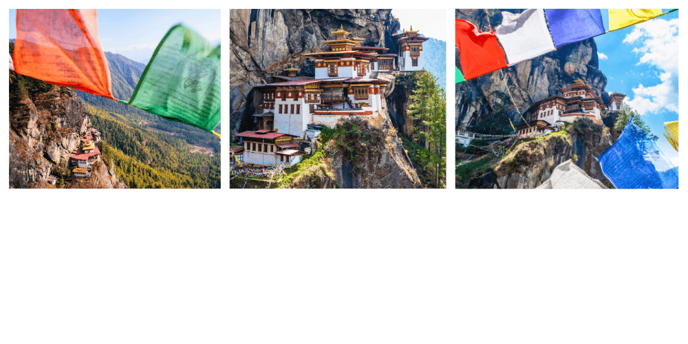 - Le monastère de Taktshang (Nid du Tigre), construit au XVIIᵉ siècle, est un site emblématique accroché à la falaise de Paro.