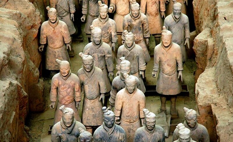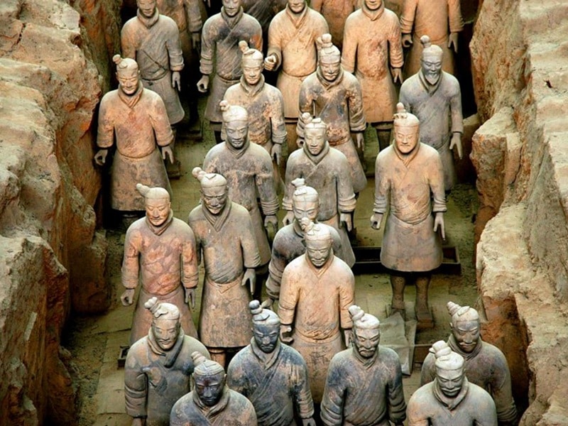 Transfert à l’aéroport de Guilin. Envol à destination de Xian. Arrivée à Xian. Départ au district de Lintong pour la visite de l’Armée en Terre Cuite. Incroyablement bien conservée, cette armée souterraine de 6 000 guerriers et chevaux de terre cuite grandeur nature, fait face à l’Est, en formation de combat. Vieille de plus de 2000 ans, cette armée fut découverte en 1974 par des paysans. Déjeuner marmite chinoise. Retour à Xian. Découverte de la mosquée et du quartier Musulman. Promenade à vélo sur les remparts de Xian, la Place du Tambour et de la Tour de la Cloche. Dîner banquet de raviolis, spécialité de la ville, accompagné d’un spectacle de chants et de danses de la dynastie des Tangs.