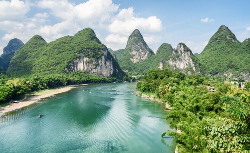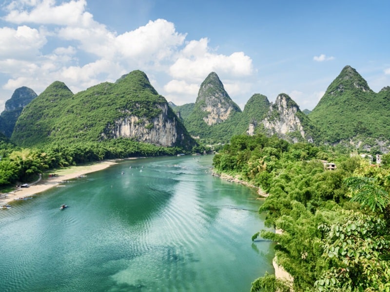 Ce matin, croisière sur la rivière Li, afin de découvrir des paysages de pains de sucre et de rizières. La rivière Li, qui serpente à travers des paysages qui ont influencé les peintres et poètes de toute la Chine, vous fera découvrir au fil de l’eau des villages pittoresques et des rivages couverts de bambou. A travers la brume du Lijiang, nombre de ces rochers aux formes curieuses surgissent devant les yeux des visiteurs. Chaque rocher, comme un lotus sorti de l’eau, projette sa silhouette dans la rivière. Déjeuner à bord. Arrivée à Yangshuo, petite ville nichée au cœur de montagnes majestueuses et traversée par la rivière Li, Yangshuo vous séduira par son charme unique. Temps libre sur le marché local de Yangshuo. Installation à l’hôtel.