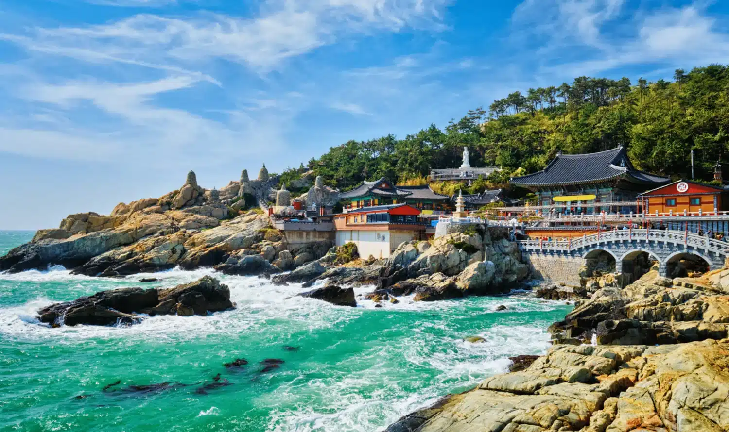 Petit déjeuner à l’hôtel. Visite du village de Gamcheon, niché sur les hauteurs de Busan, ce petit village, construit par les refugiés lors de la guerre de Corée a été décoré par des artistes en 2009 dans le cadre d’un programme de développement. Passage par le Café ZM Illenial (boisson non incluse). Déjeuner dans un restaurant local. Visite du Temple Haedong Yonggungsa. Perché sur une falaise face à la mer, il est l’un des rares temples bouddhistes côtiers de Corée. Terminez par une balade sur la Plage Gwangalli. Dîner dans un restaurant local. Nuit à l’hôtel.
